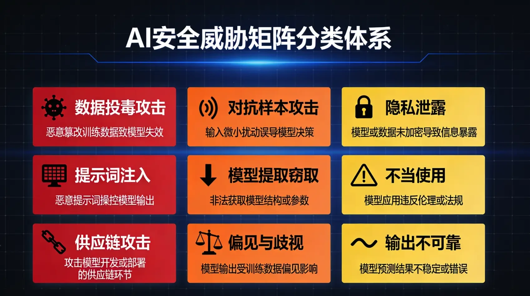 随着大型语言模型(LLM)和生成式AI的广泛应用,人工智能系统已成为关乎企业业务连续性、数据安全和用户隐私的关键基础设施。然而,与传统网络安全不同,AI系统面临的威胁具有独特的特点:攻击可以发生在数据收集、模型训练、微调优化、推理部署和运维监控的全生命周期中。从恶意的数据投毒污染模型判断能力,到精心设计的对抗样本误导系统决策,再到隐蔽的提示词注入绕过安全防护,AI系统正面临着前所未有的安全挑战。