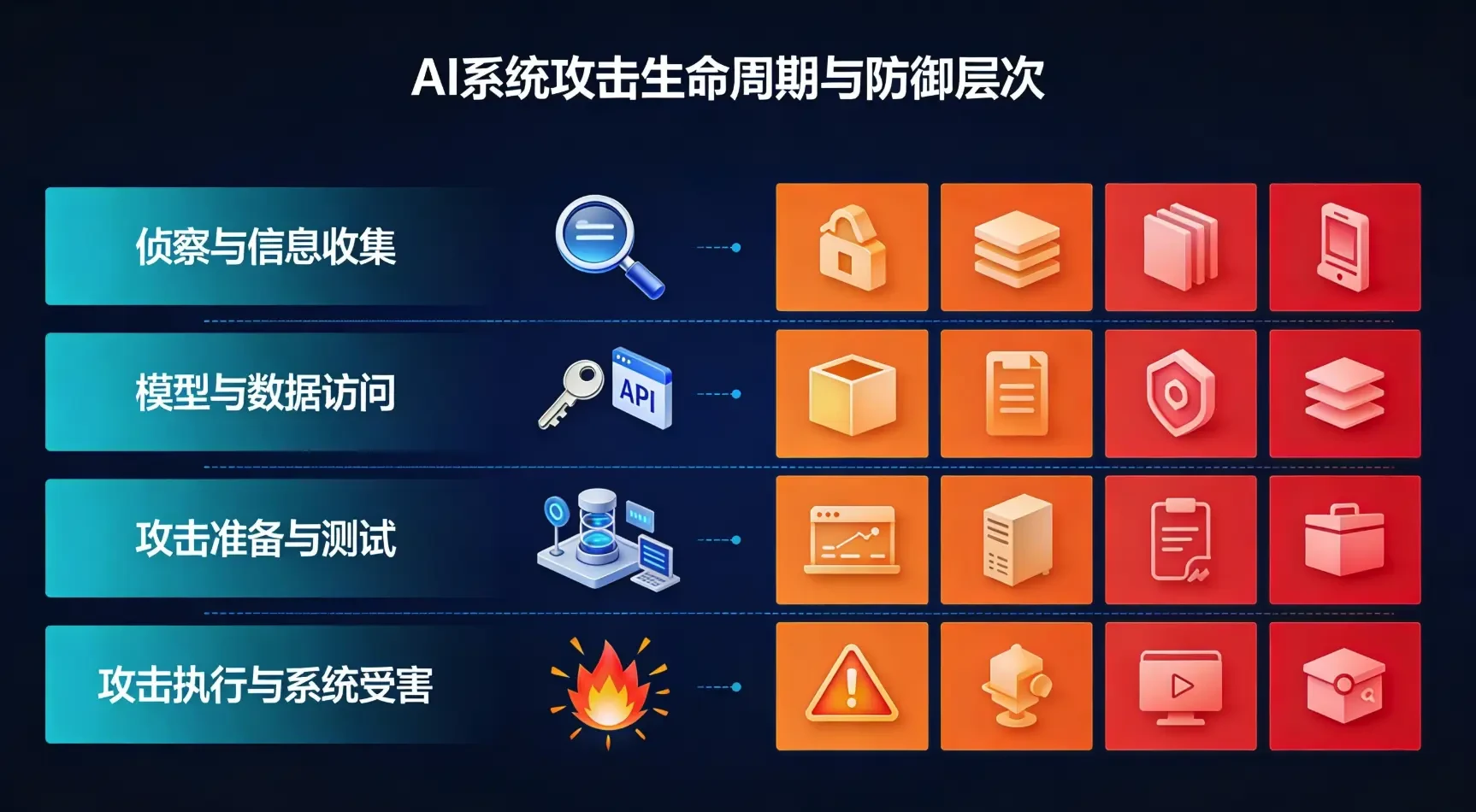 AI安全威胁矩阵以攻击链条为核心组织框架,清晰地映射了攻击者如何一步步突破AI系统的防线。这个过程类似于传统网络安全中的杀伤链模型,但针对AI系统的独特特点进行了专门设计。